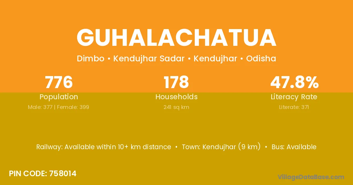Kendujhar (9 km) is the nearest town to Guhalachatua village for major economic activities and is located approximately 9 km away.