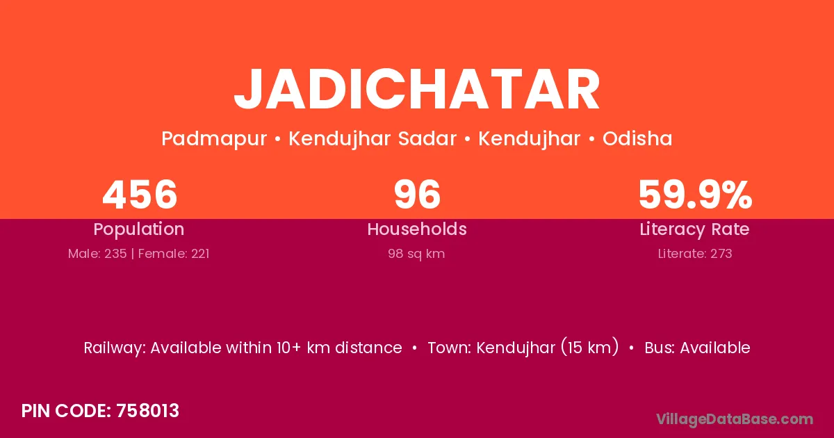 Kendujhar (15 km) is the nearest town to Jadichatar village for major economic activities and is located approximately 15 km away.