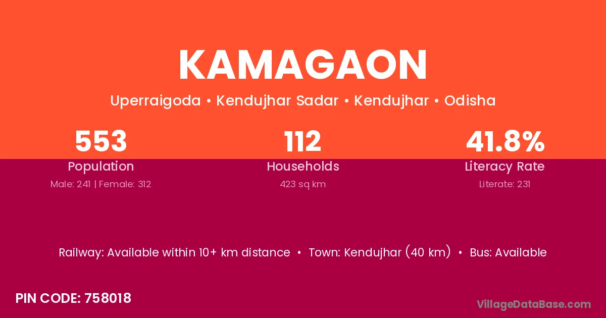 Kendujhar (40 km) is the nearest town to Kamagaon village for major economic activities and is located approximately 40 km away.