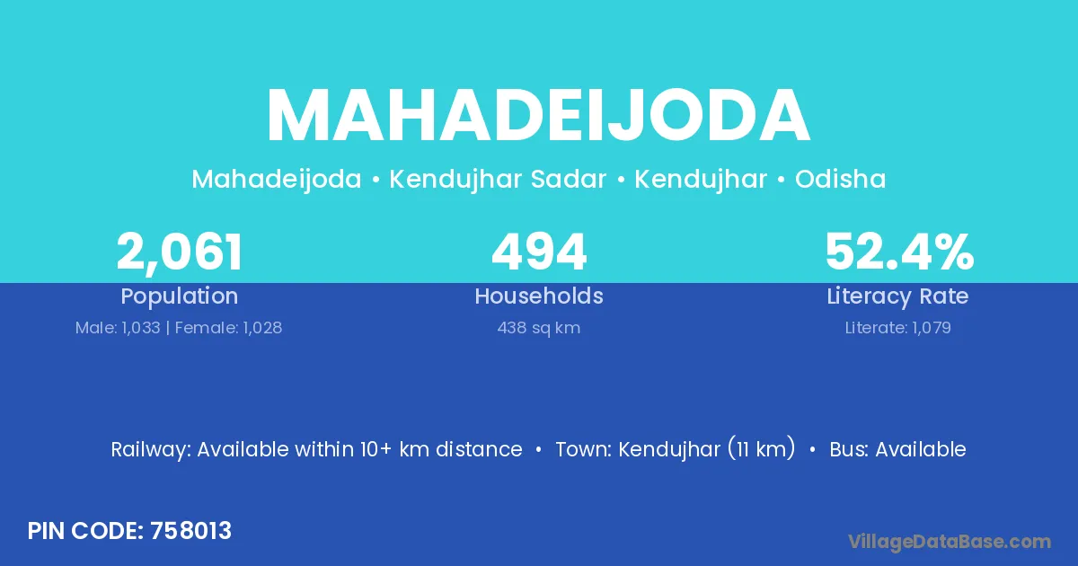 Kendujhar (11 km) is the nearest town to Mahadeijoda village for major economic activities and is located approximately 11 km away.