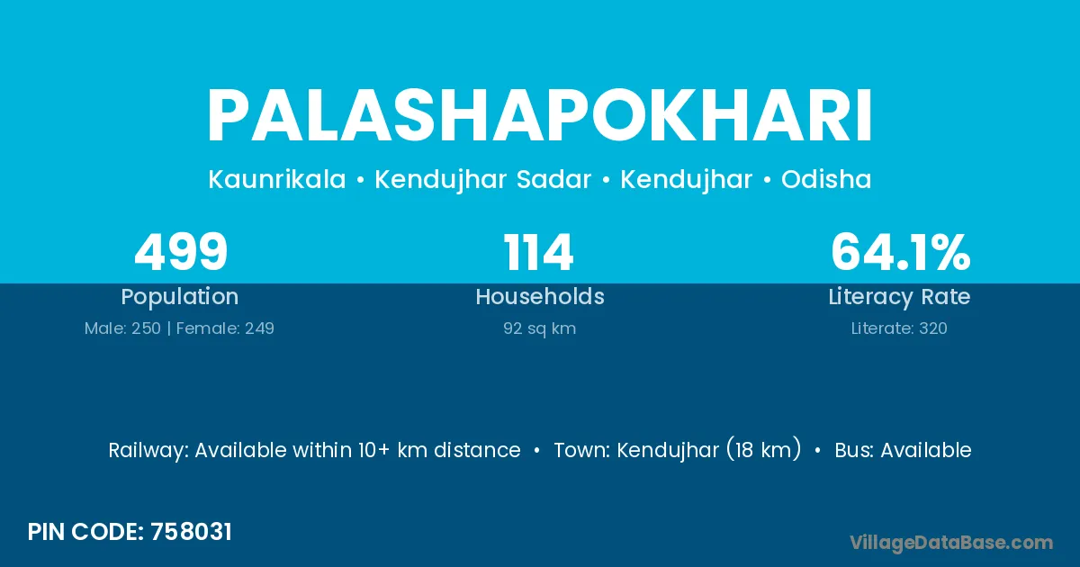 Kendujhar (18 km) is the nearest town to Palashapokhari village for major economic activities and is located approximately 18 km away.