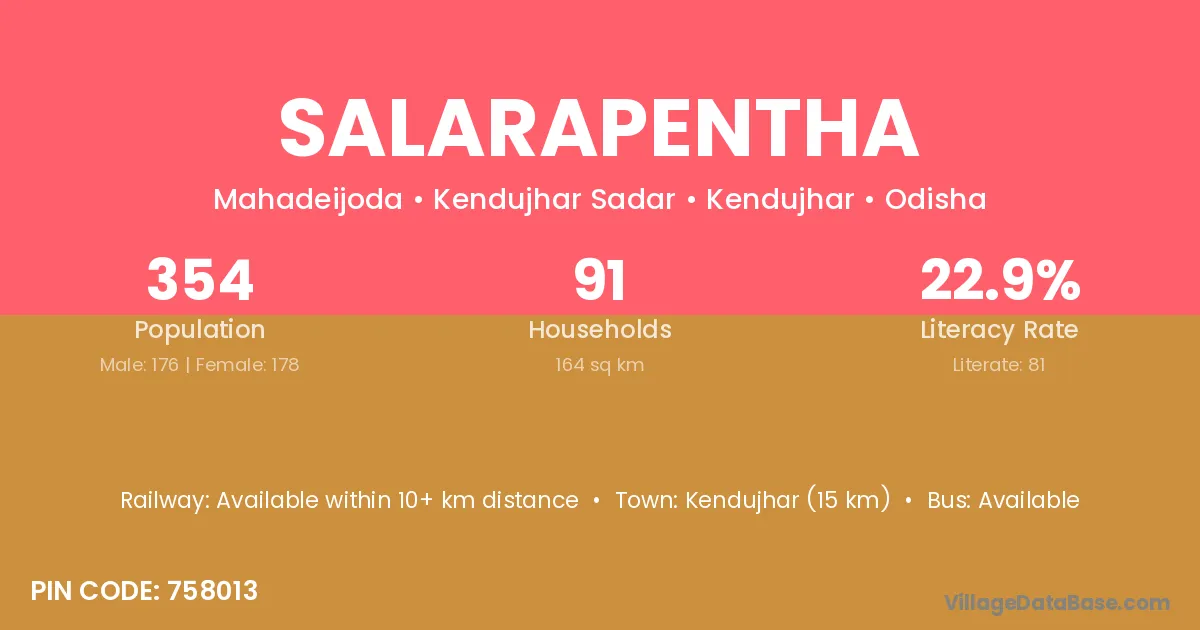 Kendujhar (15 km) is the nearest town to Salarapentha village for major economic activities and is located approximately 15 km away.