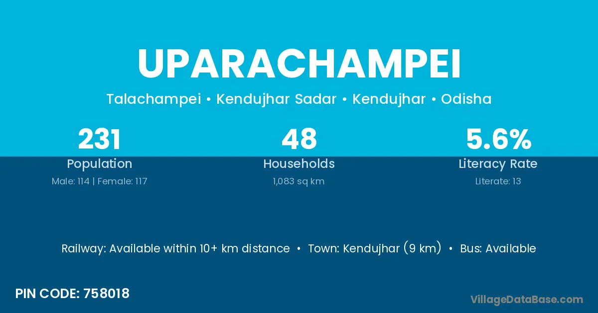 Kendujhar (9 km) is the nearest town to Uparachampei village for major economic activities and is located approximately 9 km away.