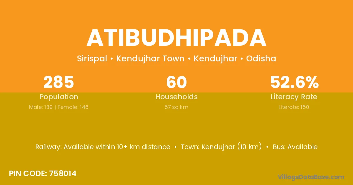 Kendujhar (10 km) is the nearest town to Atibudhipada village for major economic activities and is located approximately 10 km away.
