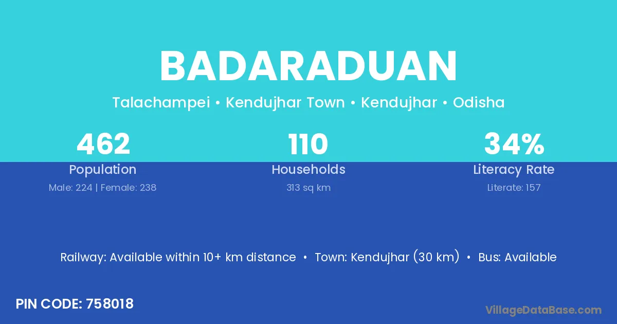 Kendujhar (30 km) is the nearest town to Badaraduan village for major economic activities and is located approximately 30 km away.