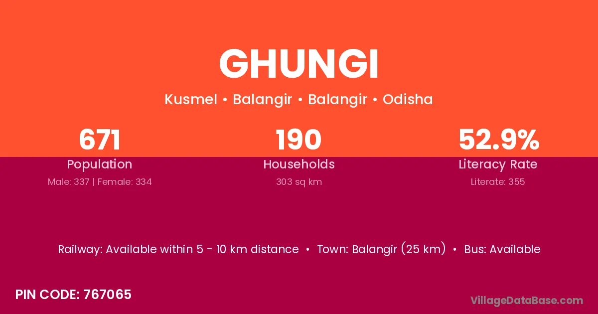 Kendujhar (50 km) is the nearest town to Ghungi village for major economic activities and is located approximately 50 km away.