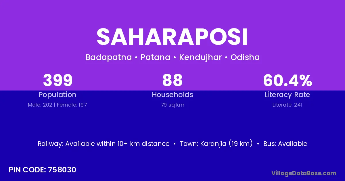 Kendujhar (7 km) is the nearest town to Saharaposi village for major economic activities and is located approximately 7 km away.