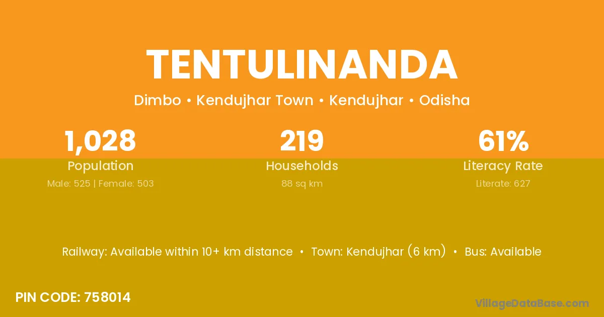 Kendujhar (6 km) is the nearest town to Tentulinanda village for major economic activities and is located approximately 6 km away.