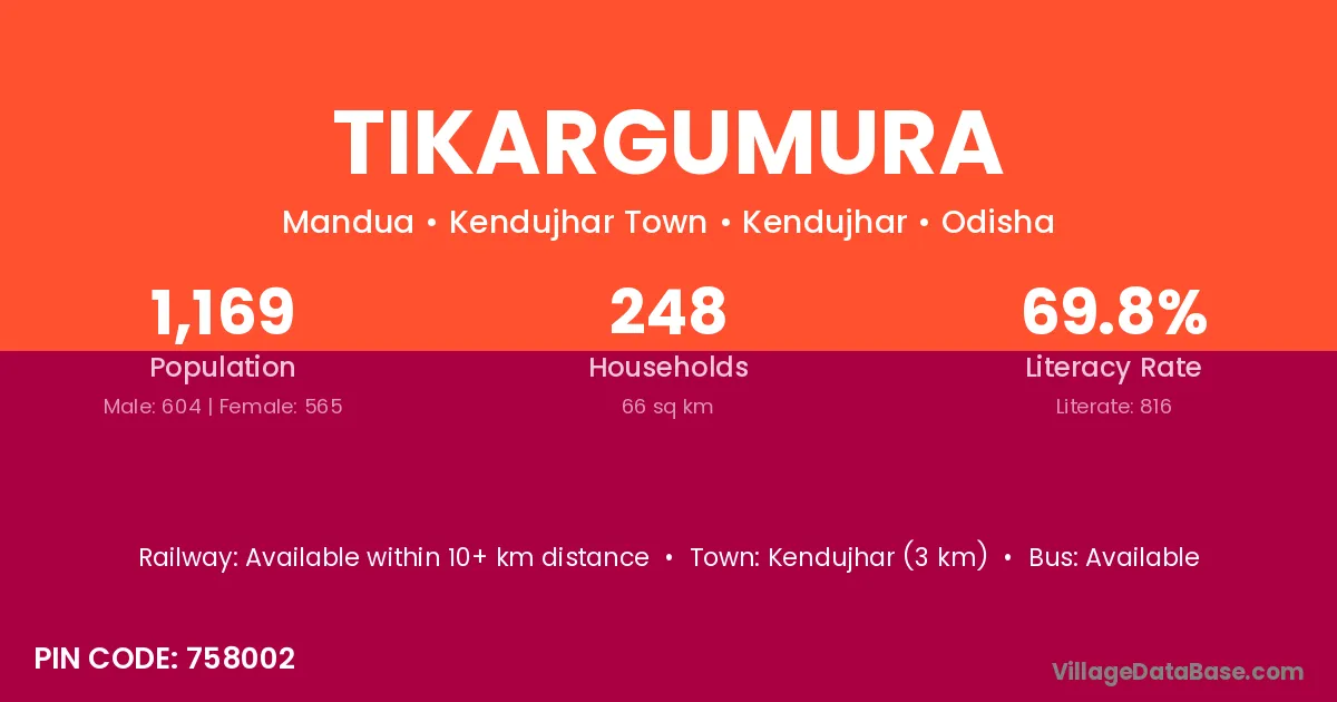 Kendujhar (3 km) is the nearest town to Tikargumura village for major economic activities and is located approximately 3 km away.