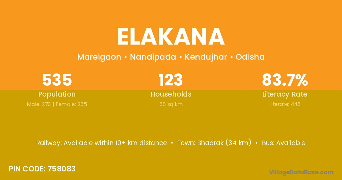 Elakana village has a total population of 535 people, of which 270 are males and 265 are females.