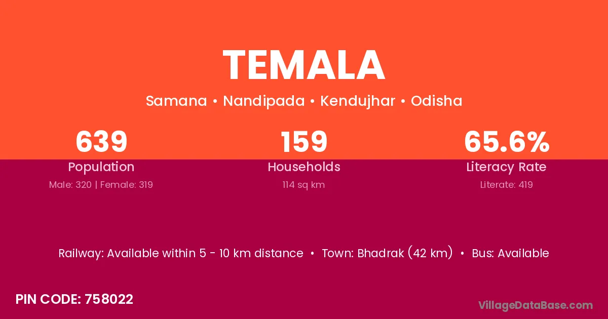 Bhadrak (42 km) is the nearest town to Temala village for major economic activities and is located approximately 42 km away.