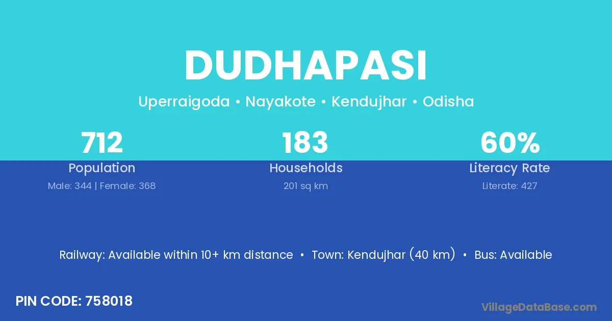 Kendujhar (40 km) is the nearest town to Dudhapasi village for major economic activities and is located approximately 40 km away.