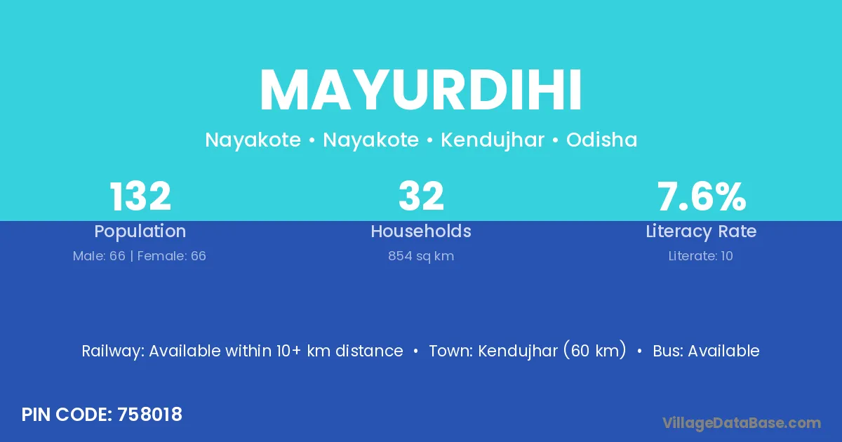 Kendujhar (60 km) is the nearest town to Mayurdihi village for major economic activities and is located approximately 60 km away.