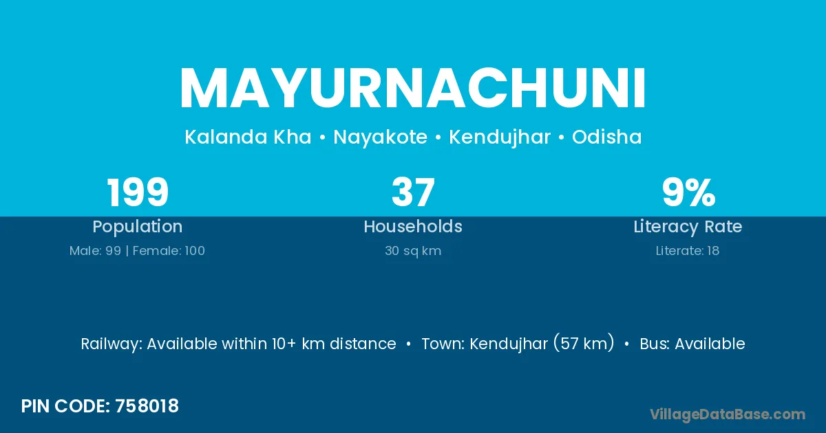 Kendujhar (57 km) is the nearest town to Mayurnachuni village for major economic activities and is located approximately 57 km away.