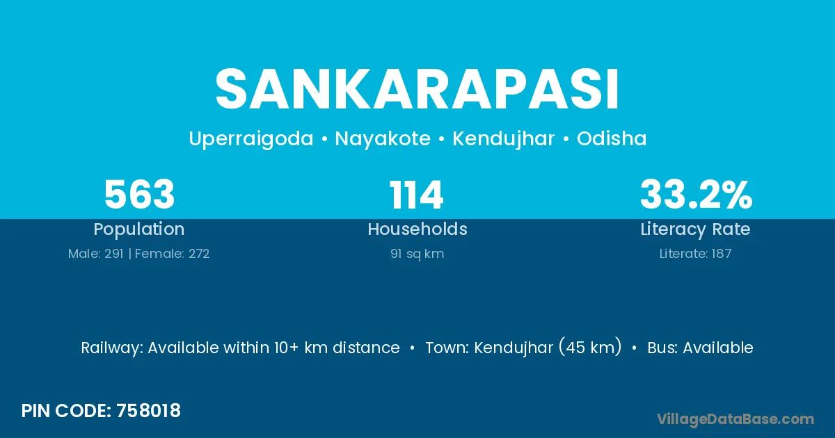 Kendujhar (45 km) is the nearest town to Sankarapasi village for major economic activities and is located approximately 45 km away.