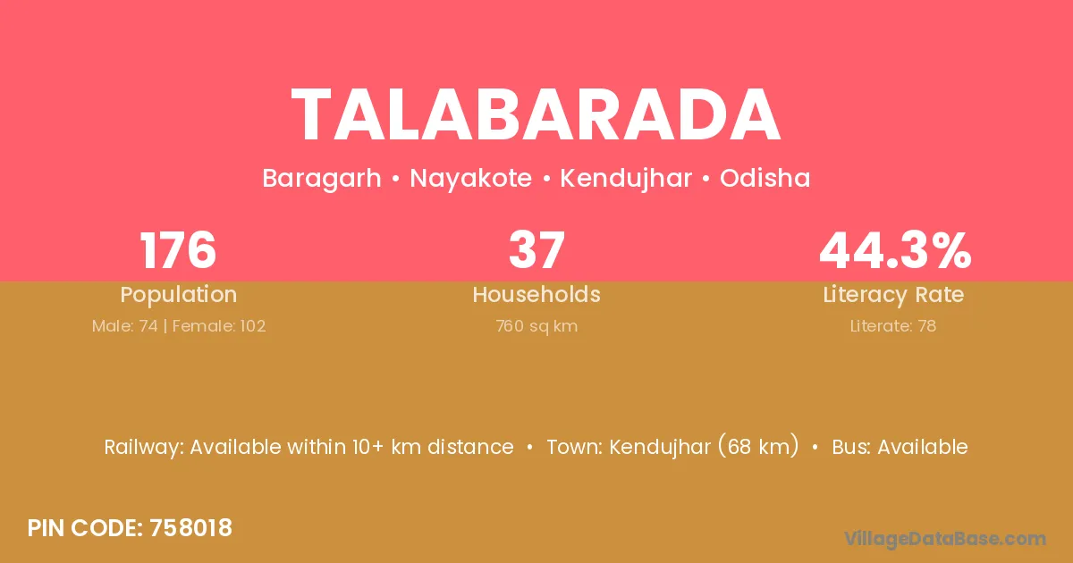 Kendujhar (68 km) is the nearest town to Talabarada village for major economic activities and is located approximately 68 km away.