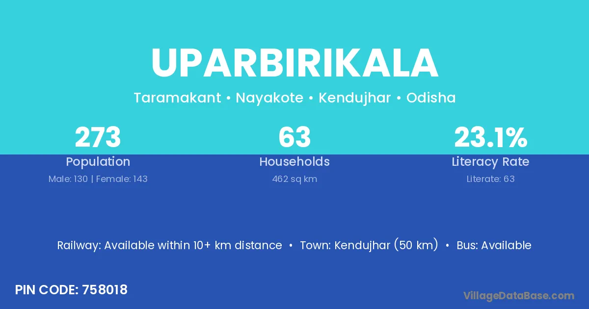 Kendujhar (50 km) is the nearest town to Uparbirikala village for major economic activities and is located approximately 50 km away.