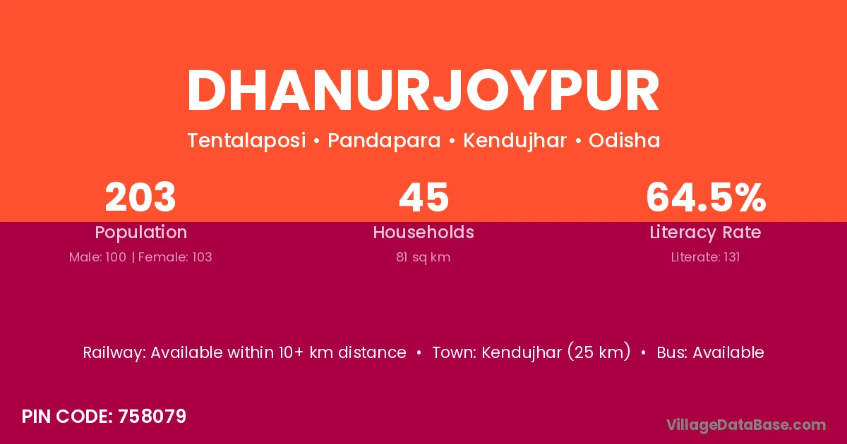 Kendujhar (25 km) is the nearest town to Dhanurjoypur village for major economic activities and is located approximately 25 km away.