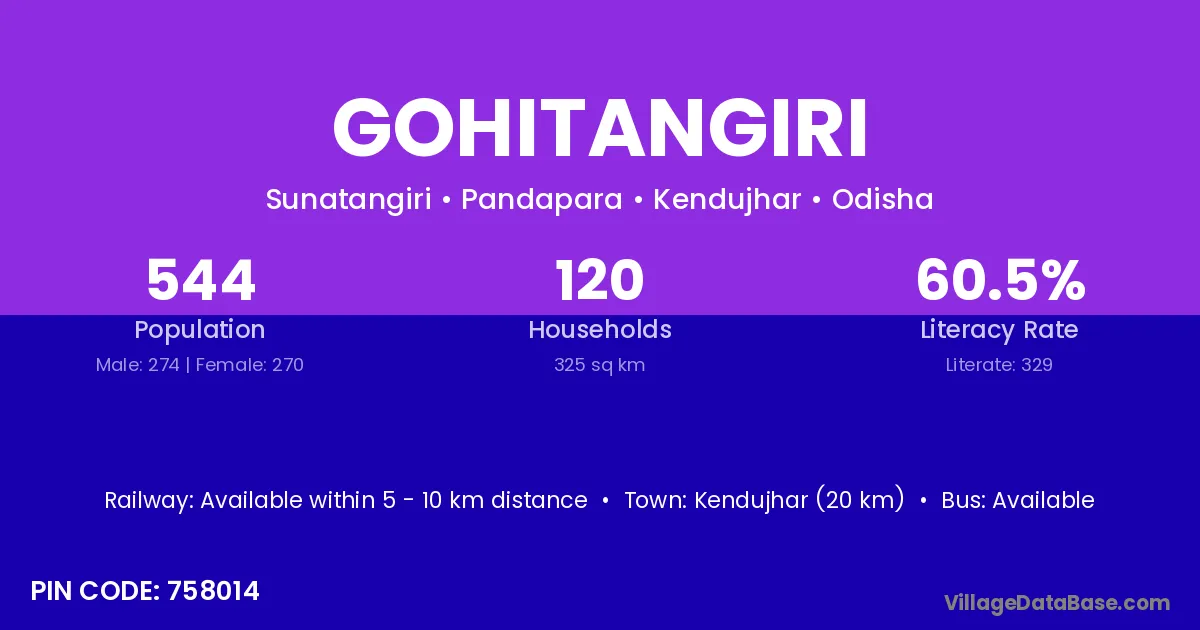 Kendujhar (20 km) is the nearest town to Gohitangiri village for major economic activities and is located approximately 20 km away.