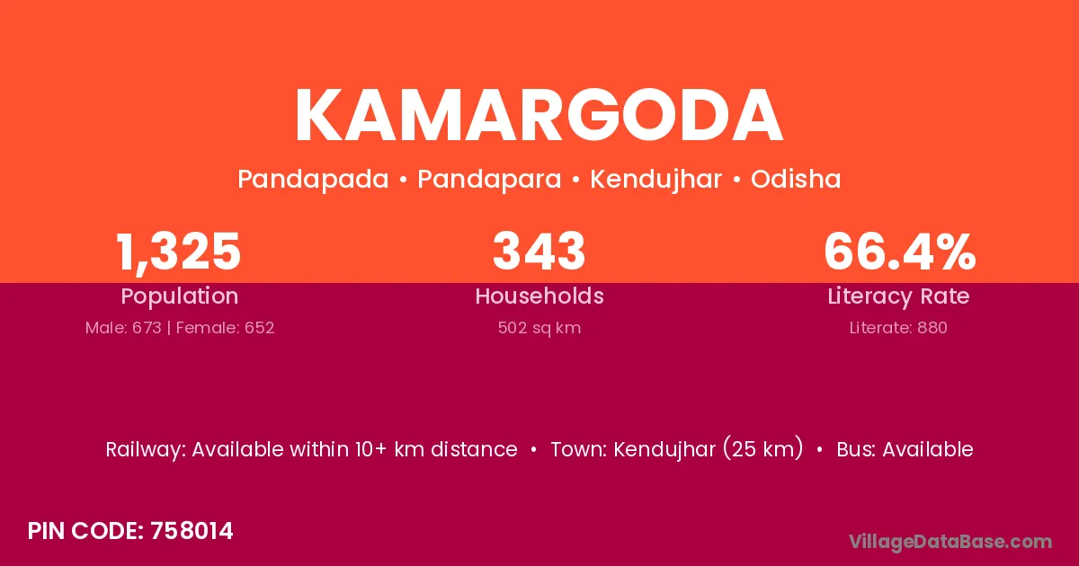 Kendujhar (25 km) is the nearest town to Kamargoda village for major economic activities and is located approximately 25 km away.