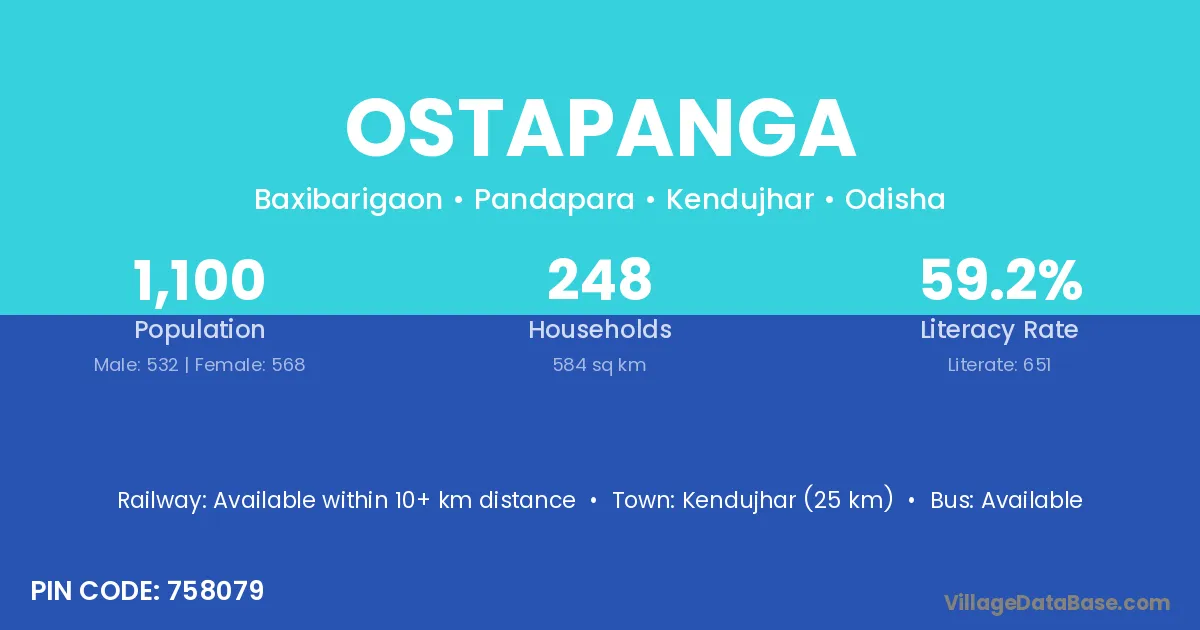 Kendujhar (25 km) is the nearest town to Ostapanga village for major economic activities and is located approximately 25 km away.