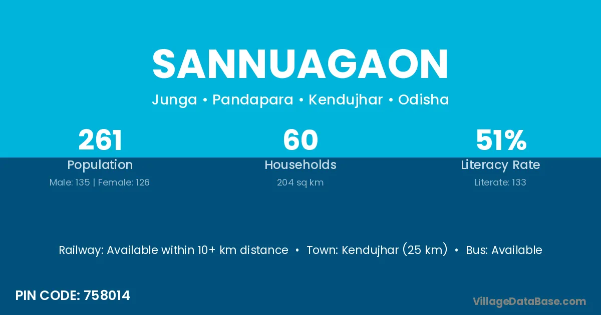 Kendujhar (25 km) is the nearest town to Sannuagaon village for major economic activities and is located approximately 25 km away.