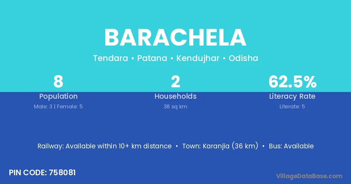 Barachela village has a total population of 8 people, of which 3 are males and 5 are females.