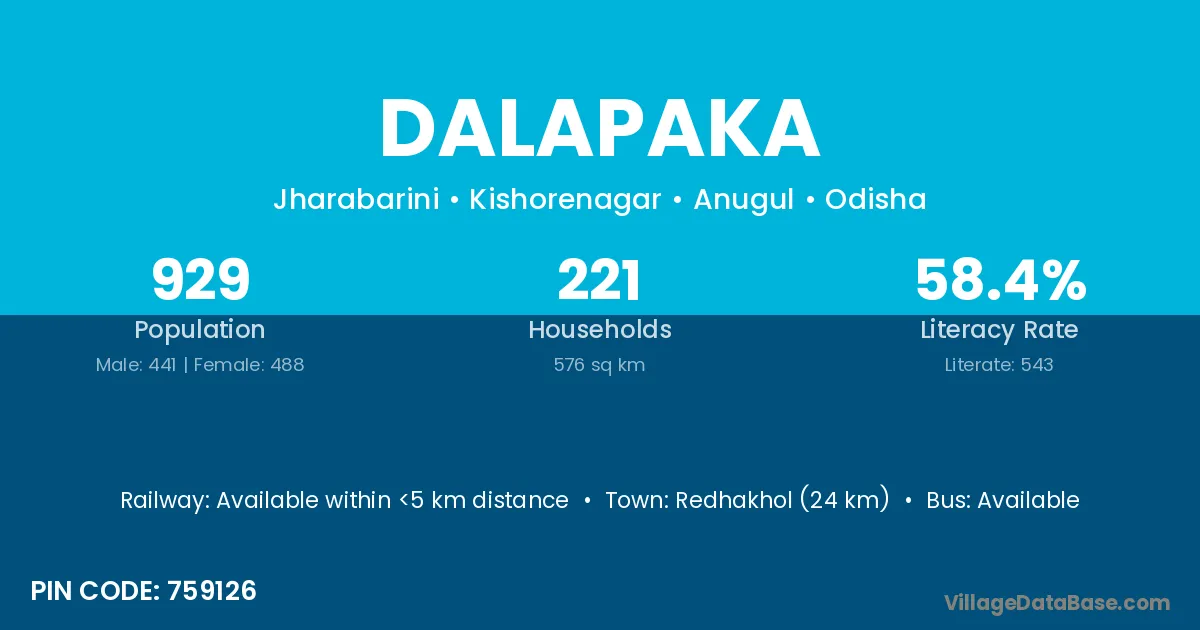 Karanjia (22 km) is the nearest town to Dalapaka village for major economic activities and is located approximately 22 km away.