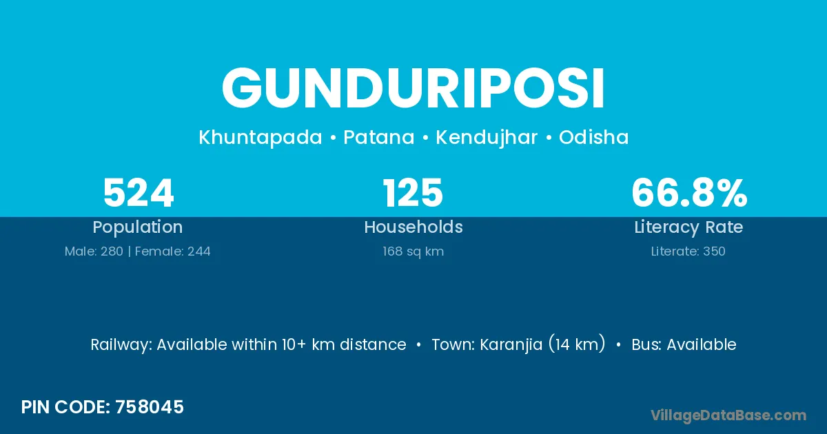 Karanjia (14 km) is the nearest town to Gunduriposi village for major economic activities and is located approximately 14 km away.