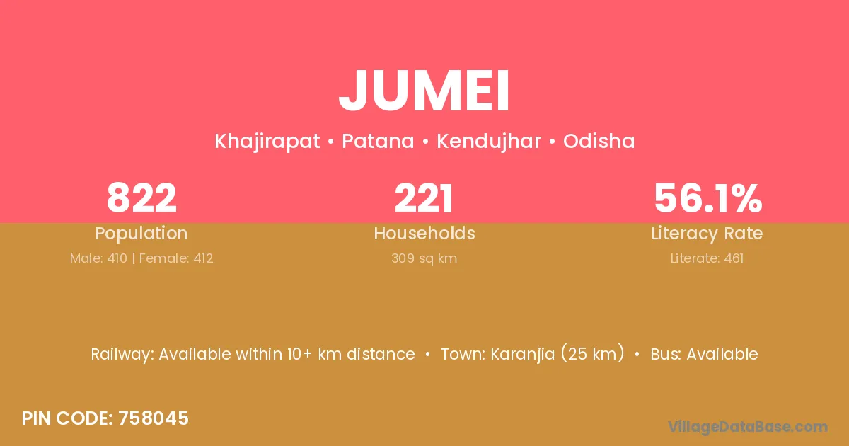Karanjia (25 km) is the nearest town to Jumei village for major economic activities and is located approximately 25 km away.