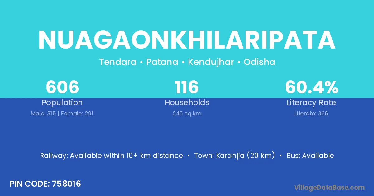 Karanjia (20 km) is the nearest town to Nuagaonkhilaripata village for major economic activities and is located approximately 20 km away.
