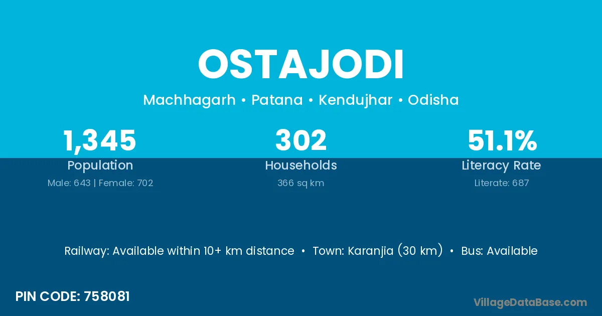 Karanjia (30 km) is the nearest town to Ostajodi village for major economic activities and is located approximately 30 km away.