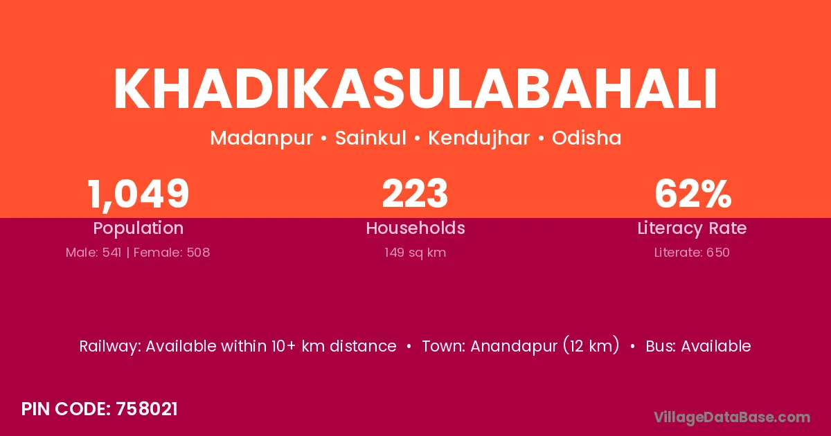 Anandapur (12 km) is the nearest town to Khadikasulabahali village for major economic activities and is located approximately 12 km away.