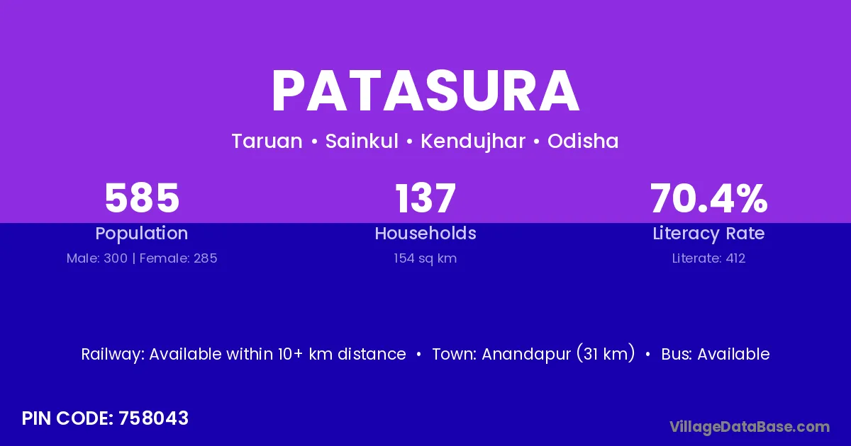 Anandapur (31 km) is the nearest town to Patasura village for major economic activities and is located approximately 31 km away.