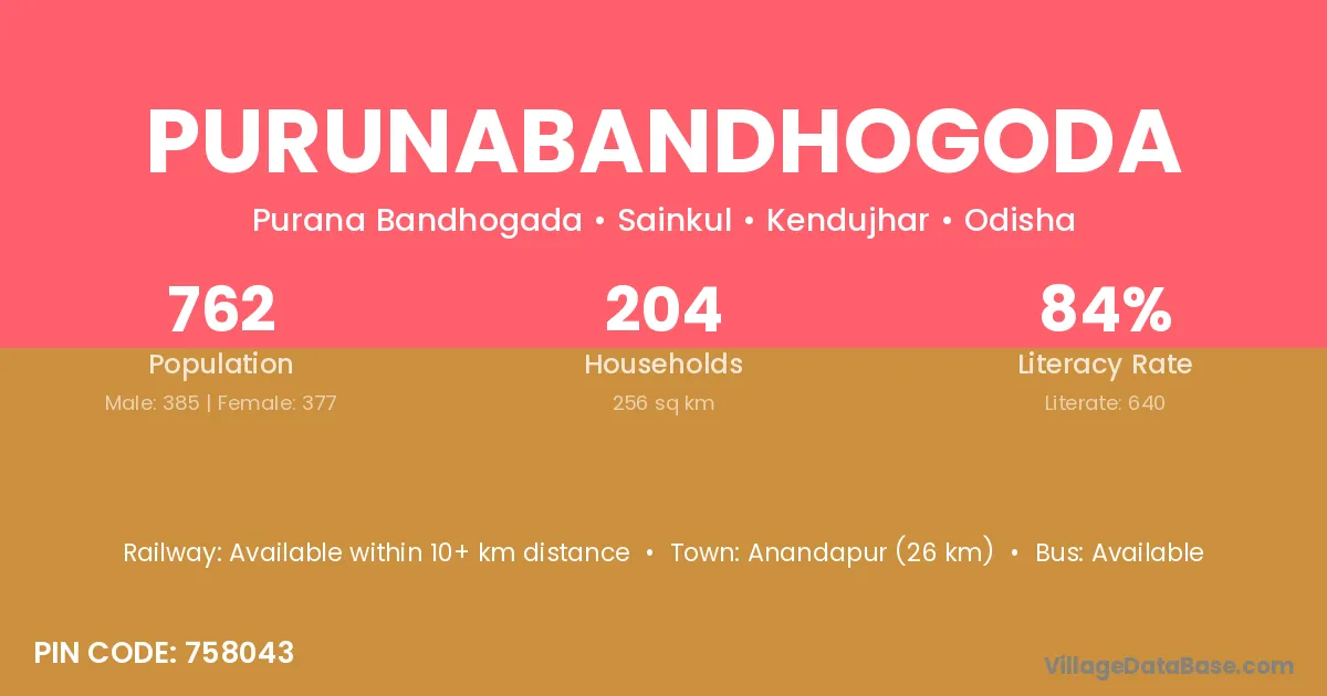 Purunabandhogoda village has a total population of 762 people, of which 385 are males and 377 are females.