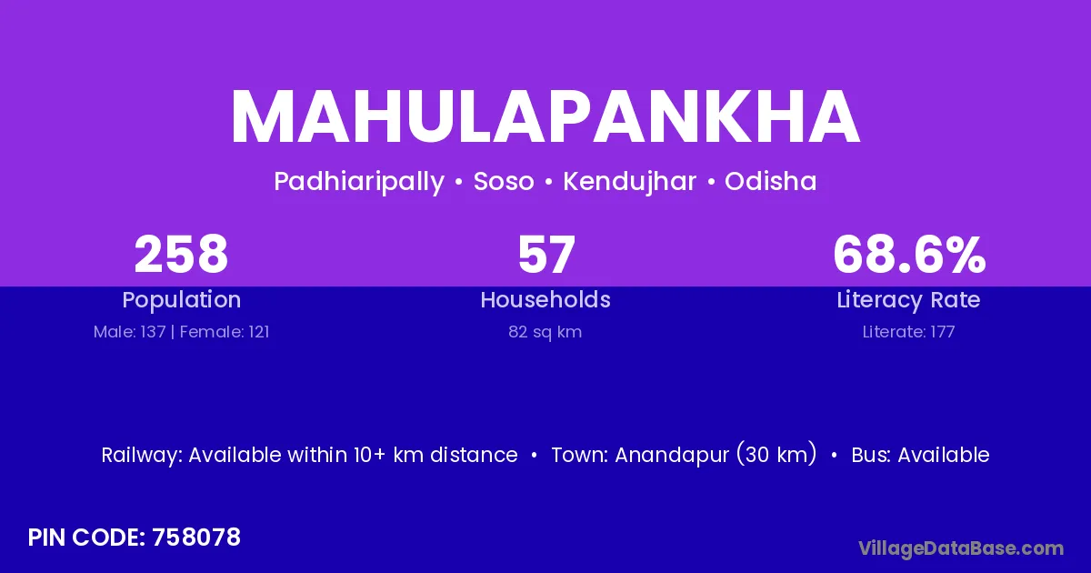 Anandapur (30 km) is the nearest town to Mahulapankha village for major economic activities and is located approximately 30 km away.