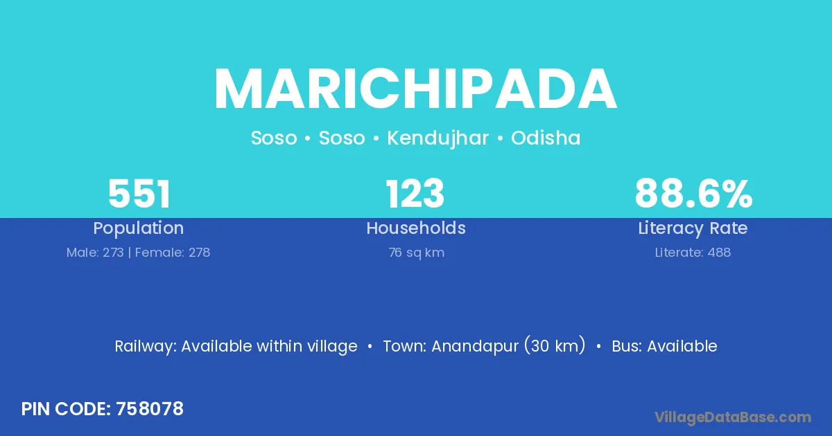 Anandapur (30 km) is the nearest town to Marichipada village for major economic activities and is located approximately 30 km away.