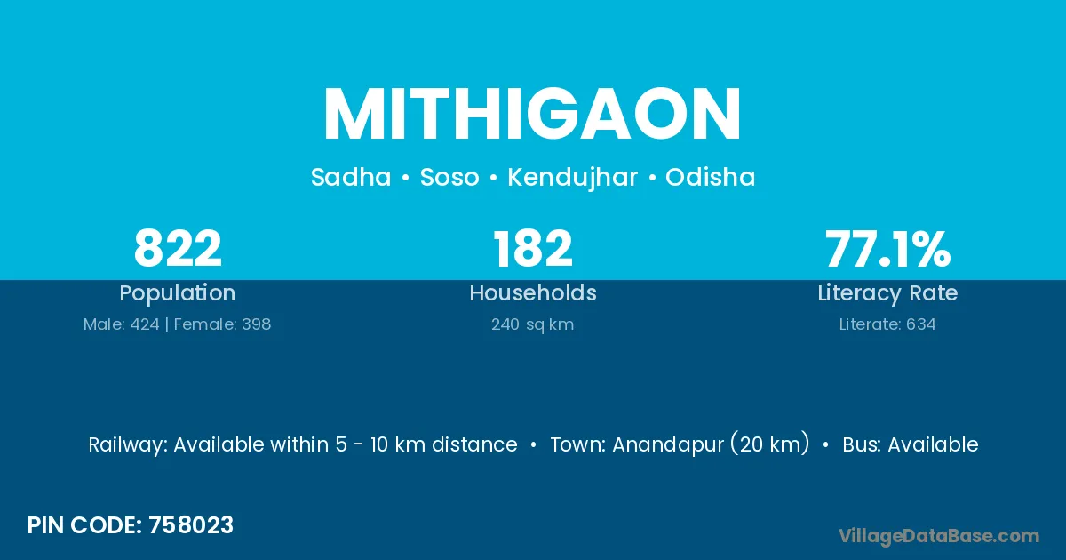 Mithigaon village is located in the Soso Tehsil of the Kendujhar district in Odisha .