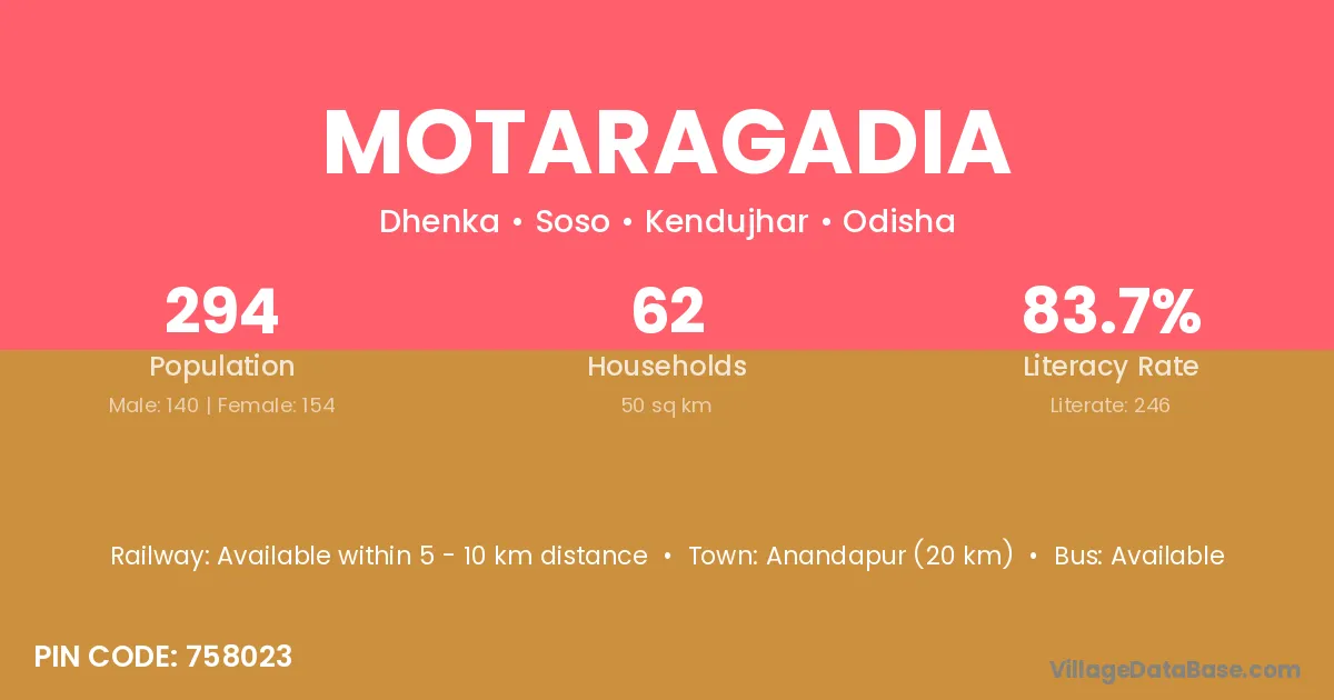 Anandapur (20 km) is the nearest town to Motaragadia village for major economic activities and is located approximately 20 km away.