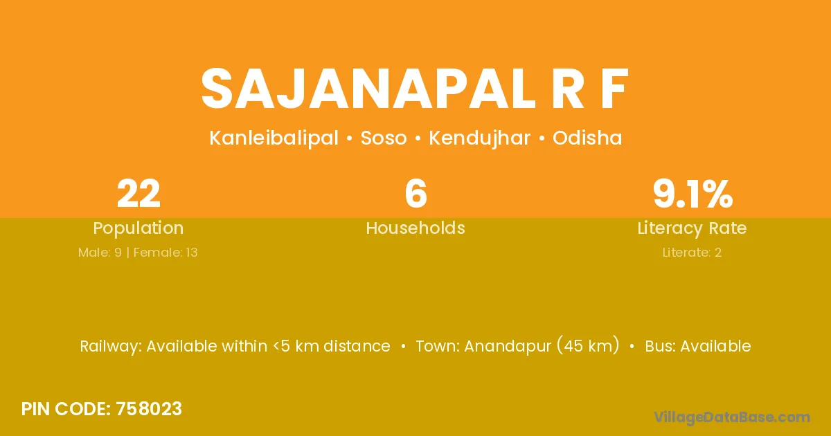 Anandapur (45 km) is the nearest town to Sajanapal R F village for major economic activities and is located approximately 45 km away.