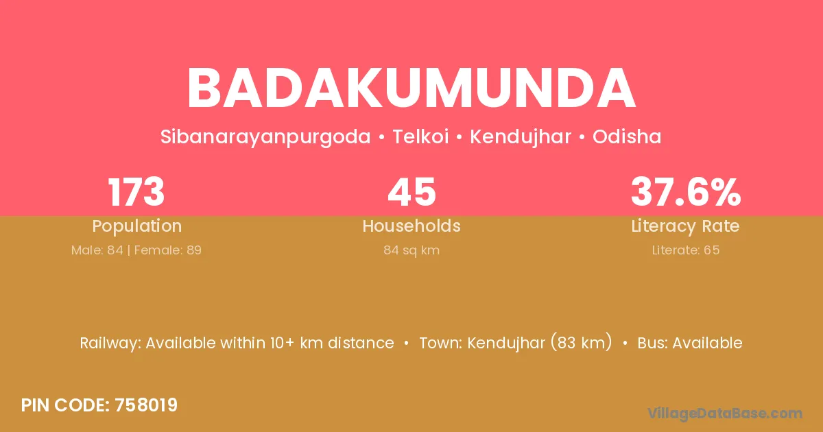 Kendujhar (83 km) is the nearest town to Badakumunda village for major economic activities and is located approximately 83 km away.