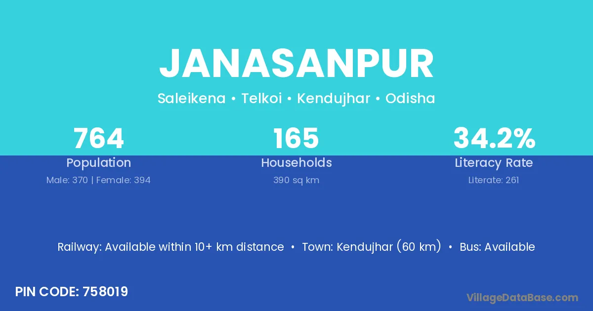 Kendujhar (60 km) is the nearest town to Janasanpur village for major economic activities and is located approximately 60 km away.