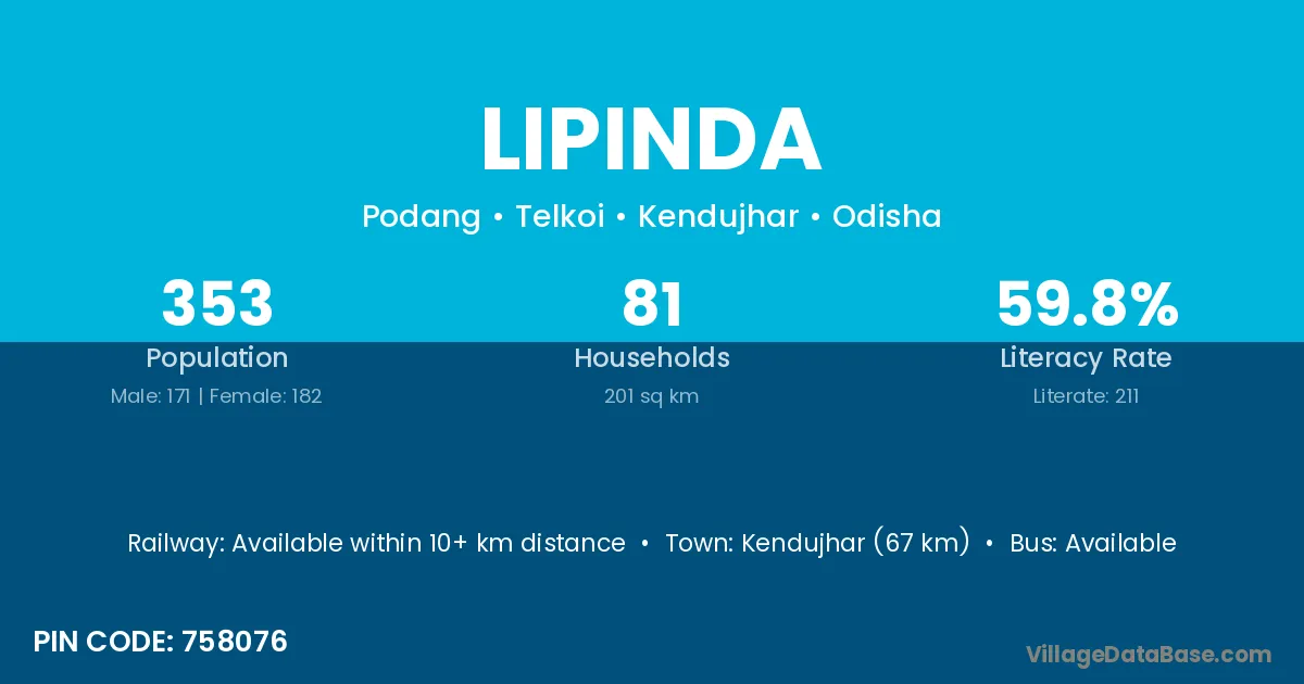 Kendujhar (67 km) is the nearest town to Lipinda village for major economic activities and is located approximately 67 km away.