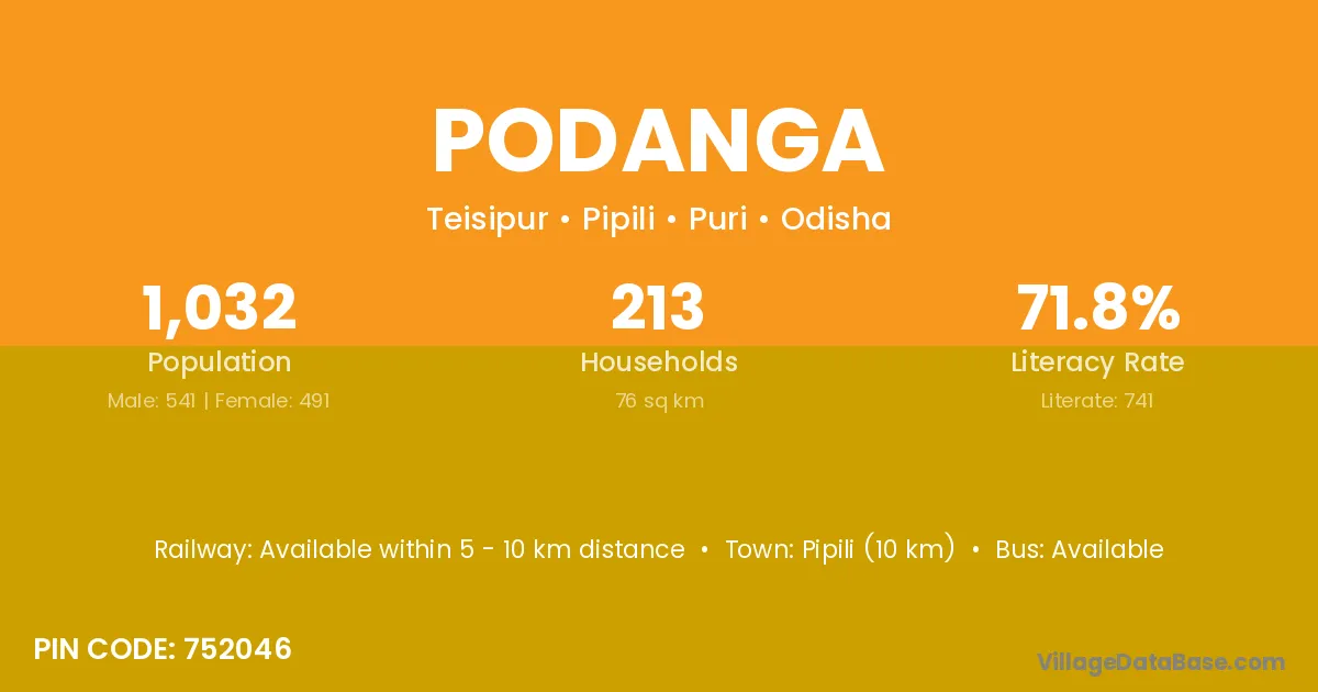 Kendujhar (65 km) is the nearest town to Podanga village for major economic activities and is located approximately 65 km away.