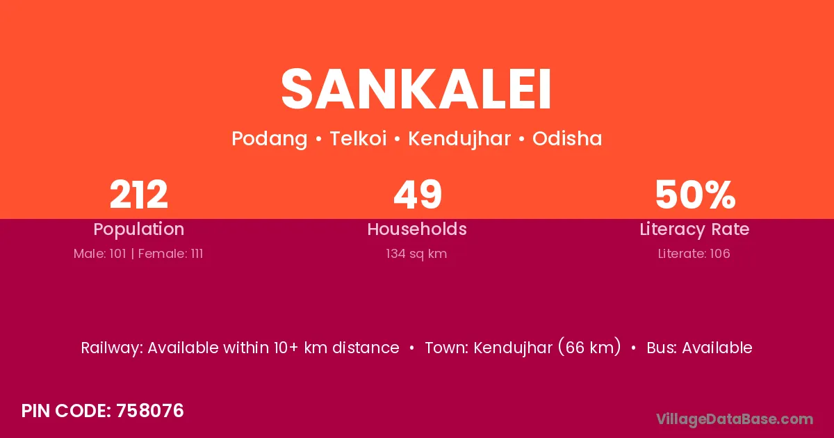 Kendujhar (66 km) is the nearest town to Sankalei village for major economic activities and is located approximately 66 km away.