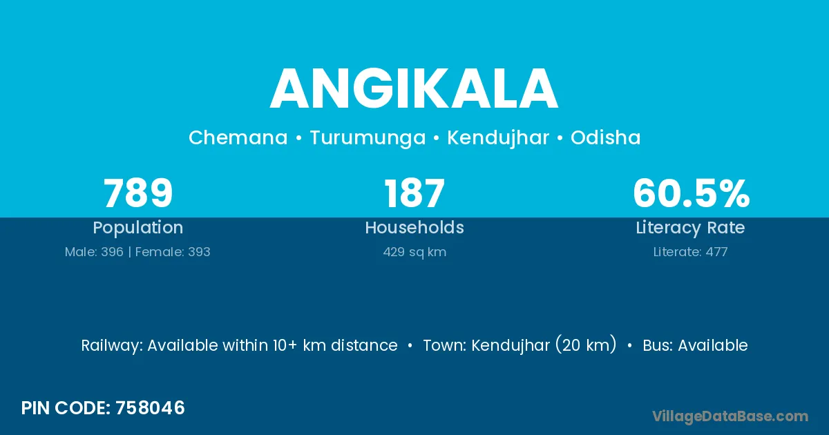 Kendujhar (20 km) is the nearest town to Angikala village for major economic activities and is located approximately 20 km away.