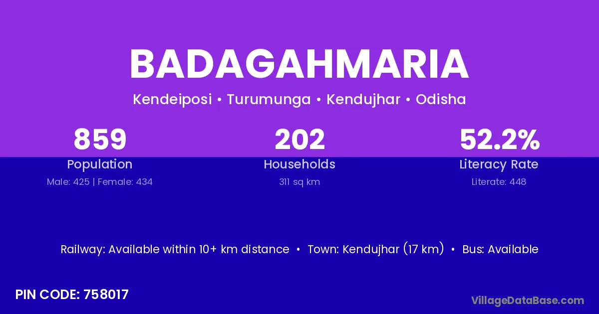 Kendujhar (17 km) is the nearest town to Badagahmaria village for major economic activities and is located approximately 17 km away.