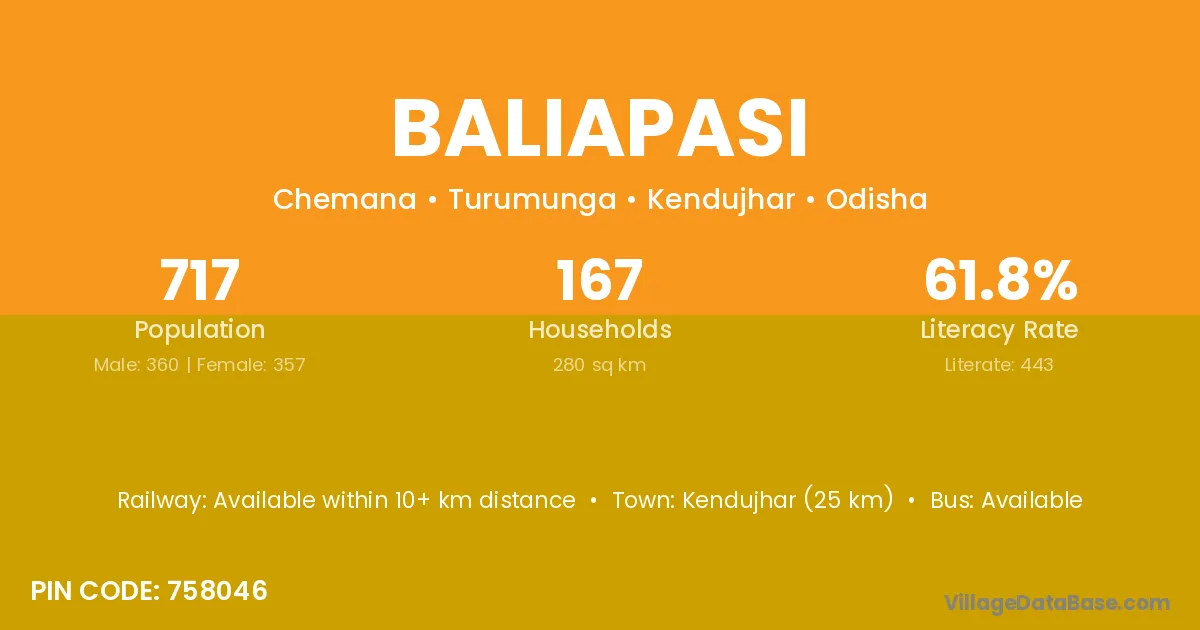 Kendujhar (25 km) is the nearest town to Baliapasi village for major economic activities and is located approximately 25 km away.