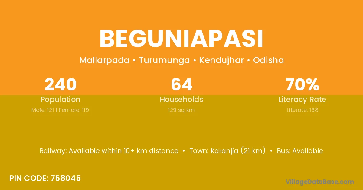 Karanjia (21 km) is the nearest town to Beguniapasi village for major economic activities and is located approximately 21 km away.