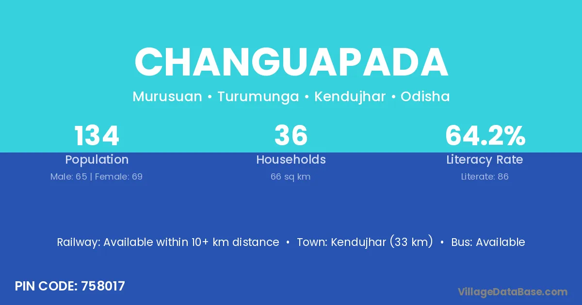 Kendujhar (33 km) is the nearest town to Changuapada village for major economic activities and is located approximately 33 km away.